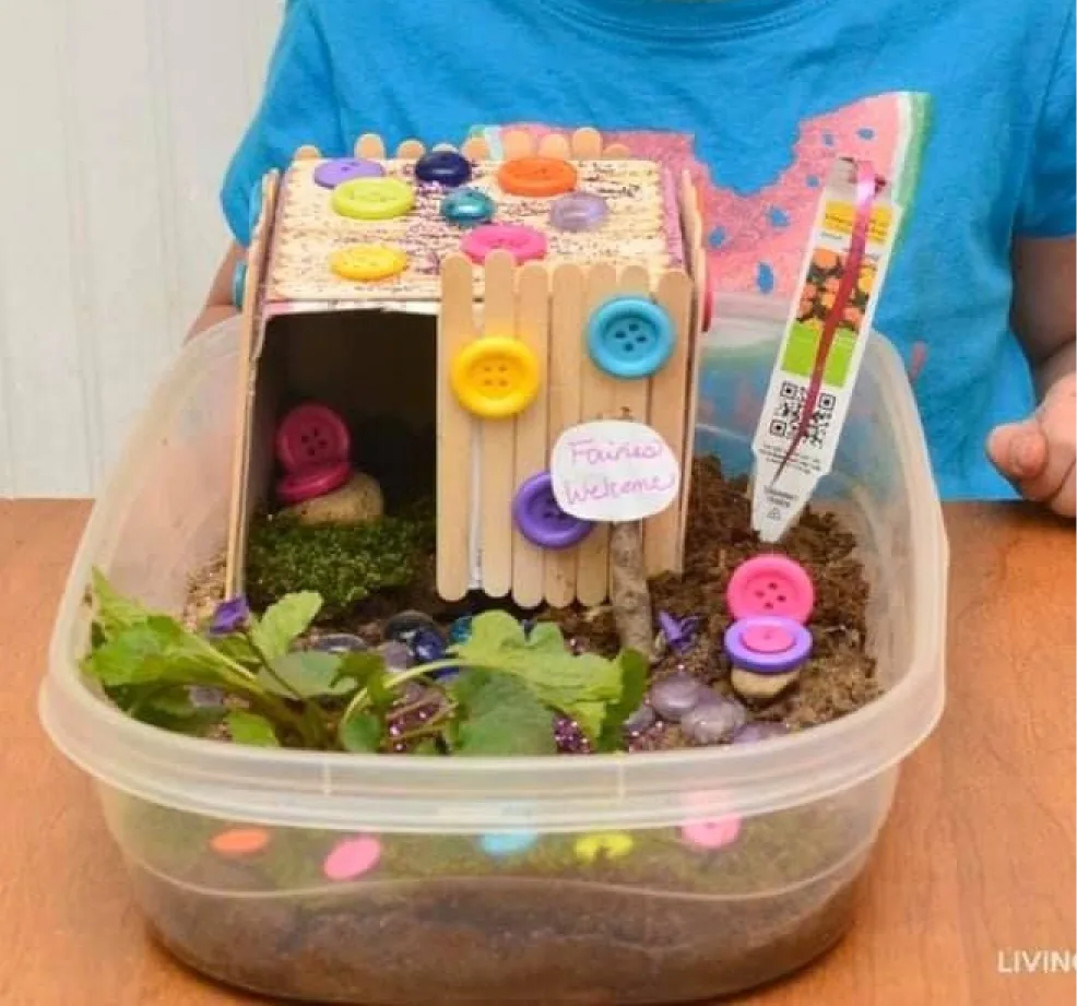 You don’t need anything fancy – a box, ice cream container, yoghurt pottles. Decorate it, cut doors and windows into it. Find a lovely place in your garden and place it there. Decorate the garden to attract the fairies and Dino’s.